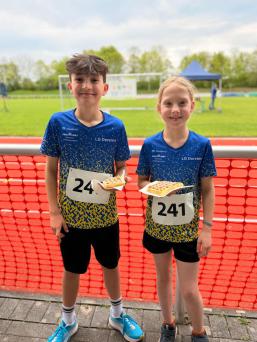 Gleich zwei erste Plätze erreichte Lias Weinhardt (M8) über 50 m (8,75 sec) und im Weitspung, wo er mit 3,03 m erstmals die "Drei-Meter-Marke" übersprang. Außerdem wurde er Fünfter mit dem Schlagball (16 m). Einem Start-Ziel-Sieg lief Viktoria Berse (W11) über 800 m nach 3:06,24 min entgegen.