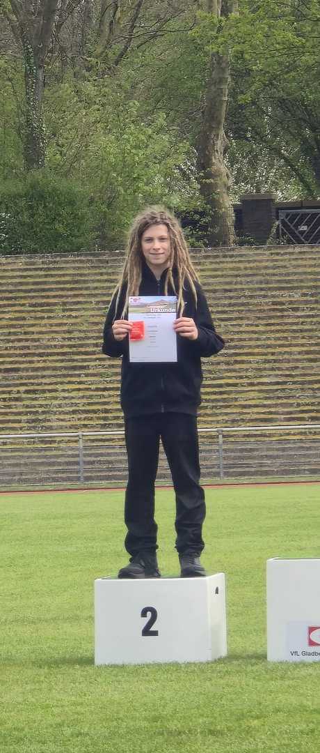 Aber es sollten für die LG Dorsten noch besser kommen: Sein Bruder Fynn Weinhardt (M12) wurde mit 1,30 m im Hochsprung Zweiter und gewann anschließend den Weitsprung mit 4,18 m - Bestleistung eingestellt! Tobias Glowacki (M13) sprang 4,45 m weit und bekam dann "Silber" bei der Siegerehrung umgehängt.
